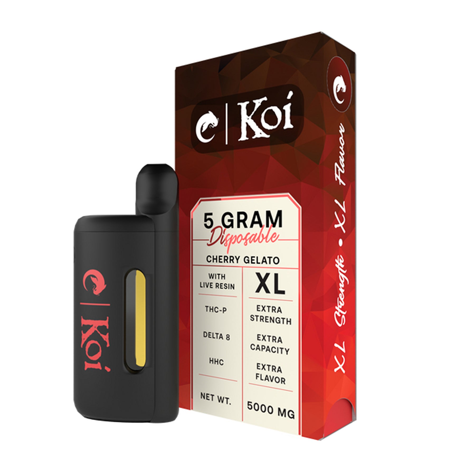 Featuring an XL 5-gram capacity, this Koi 5 Gram THC-P Live Resin Disposable Vape is perfect for larger appetites and extended vaping sessions. It also has a cotton-wrapped ceramic coil and a 380 mAh rechargeable battery, ensuring superior cloud production with each draw. The air-activated draw and preheat functionality make it easy to start vaping immediately.