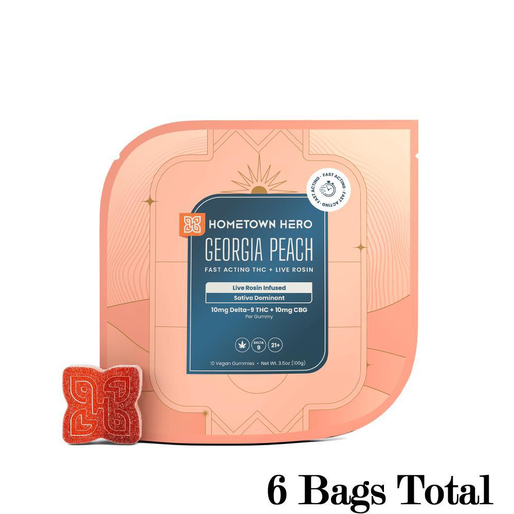 Experience a new level of uplifting energy with Hometown Hero's Live Rosin Sativa Gummies. Each delicious Georgia Peach-flavored gummy is infused with a powerful blend of 10mg Delta-9 THC, 10mg CBG, and sativa-dominant live rosin concentrate. This formulation is expertly crafted to provide an energetic, vibrant, and truly premium edible experience.