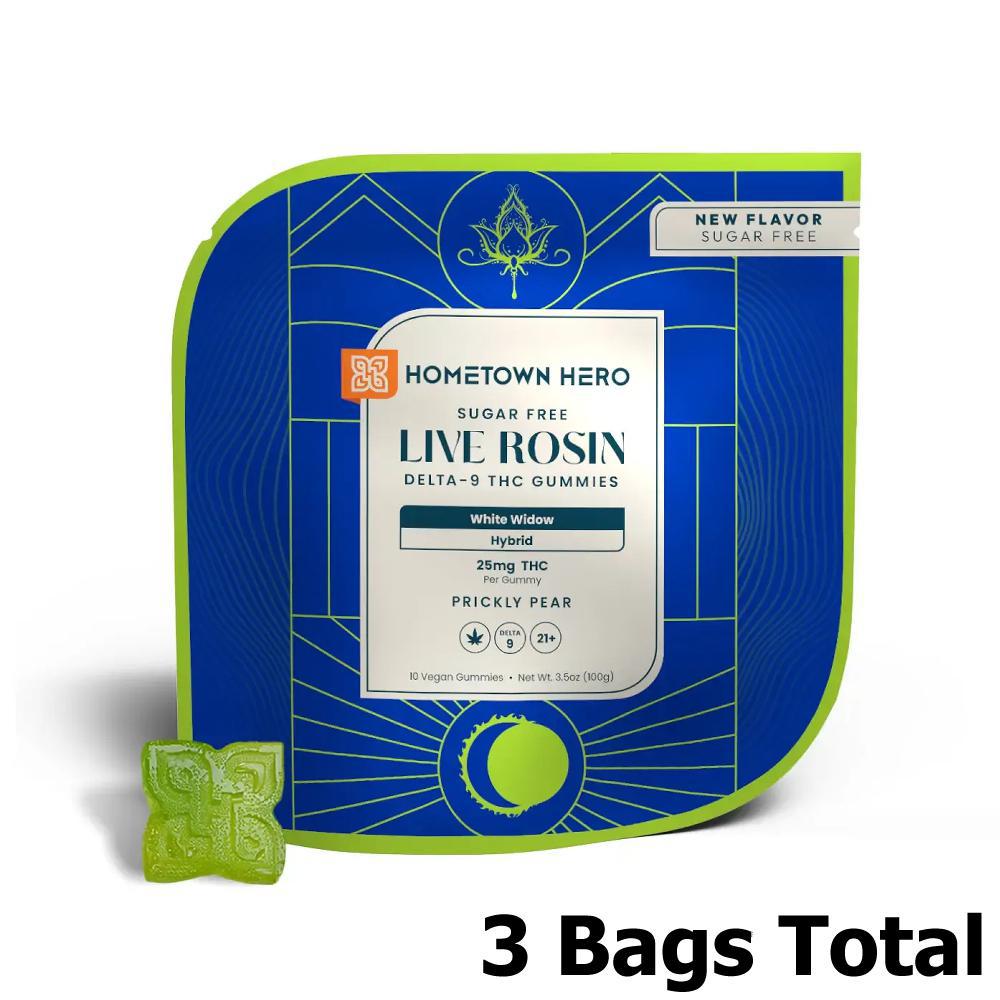 Discover a delicious way to enjoy Delta-9 THC with Hometown Hero's Sugar-Free THC Gummies in Prickly Pear flavor. These gummies deliver a potent 25mg of Delta-9 THC per piece, combined with the robust effects of White Widow live rosin. Perfect for those who want the benefits of THC without the sugar, these gummies offer a balanced experience in every bite.